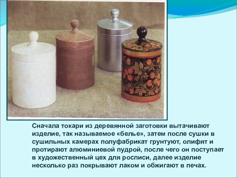 Слайд 9Сначала токари из деревянной заготовки вытачивают изделие, так называемое «белье», затем