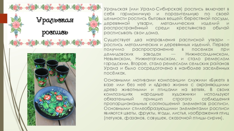 Слайд 10Уральская (или Урало-Сибирская) роспись включает в себя гармоничную и поразительную по