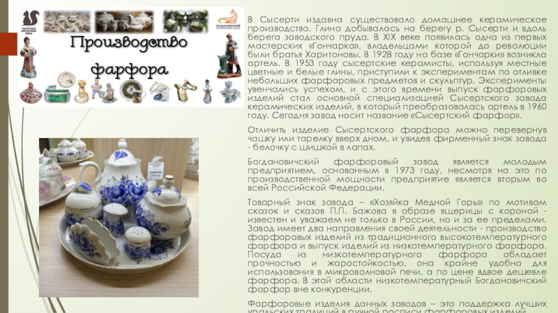 Слайд 11В Сысерти издавна существовало домашнее керамическое производство. Глина добывалась на берегу