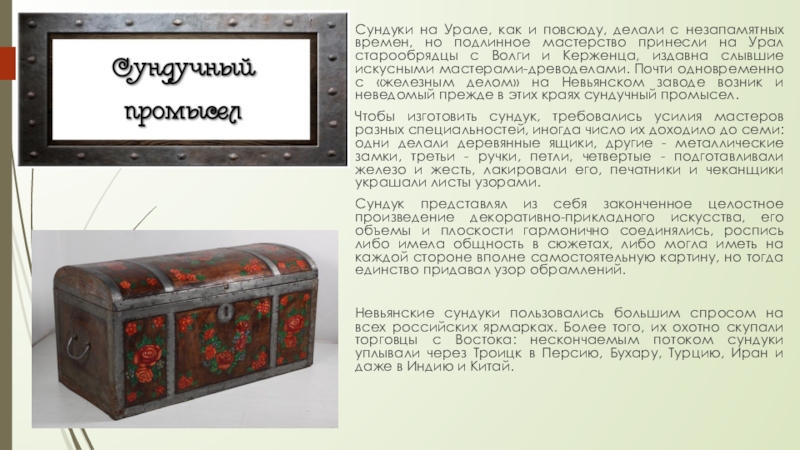 подлинное мастерство принесли на Урал старообрядцы с Волги и Керженца, издавна слывшие искусными мастерами-древоделами. Почти одновременно с «железным делом» на Невьянском заводе возник и неведомый прежде в этих краях сундучный промысел.