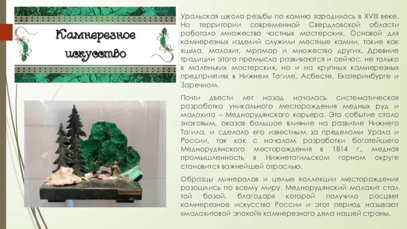 Слайд 8Уральская школа резьбы по камню зародилась в XVIII веке. На территории