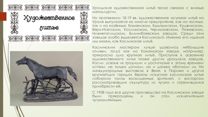 вв. художественное чугунное литьё на Урале выпускается на многих предприятиях, как на частных, так и на казённых: Каменском, Кыштымском, Кушвинском, Верх-Исетском, Каслинском, Чермозовском, Пожевском, Нижнетагильском, Билимбаевском заводах. Среди этих заводов особо выделяется Каслинский. Именно его изделия мы знаем, как Каслинское литьё.