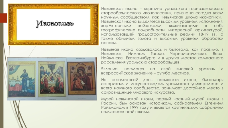 Слайд 5Невьянская икона – вершина уральского горнозаводского старообрядческого иконописания, признана сегодня всем