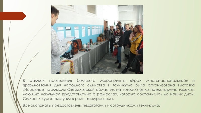 единства в техникуме была организована выставка «Народные промыслы Свердловской области», на которой были представлены изделия, дающие наглядное представление о ремеслах, которые сохранились до наших дней. Студент 4 курса выступил в роли экскурсовода.