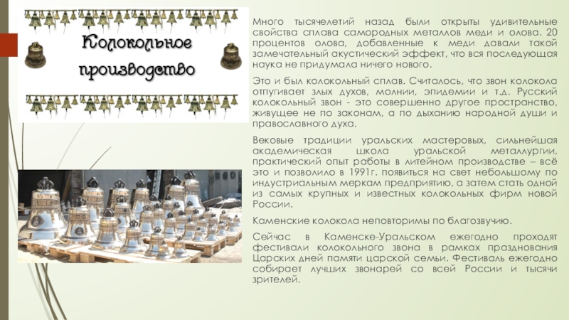 Вековые традиции уральских мастеровых, сильнейшая академическая школа уральской металлургии, практический опыт работы в литейном производстве – всё это и позволило в 1991г. появиться на свет небольшому по индустриальным меркам предприятию, а затем стать одной из самых крупных и известных колокольных фирм новой России.