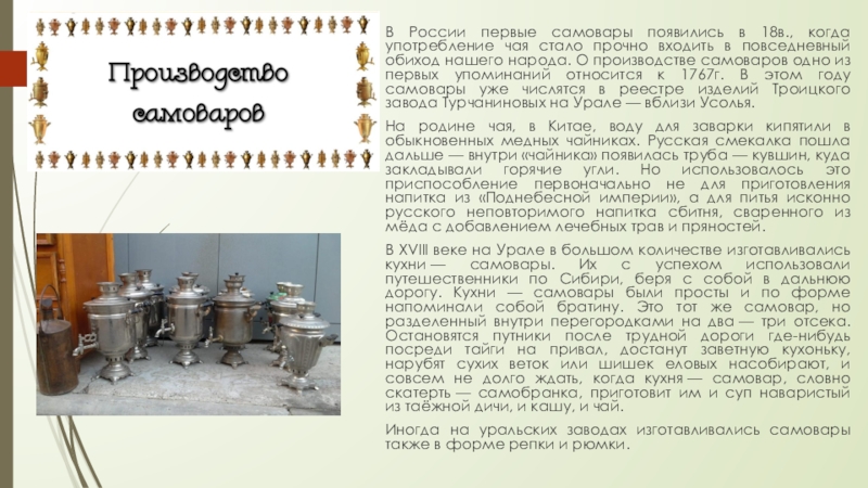 прочно входить в повседневный обиход нашего народа. О производстве самоваров одно из первых упоминаний относится к 1767г. В этом году самовары уже числятся в реестре изделий Троицкого завода Турчаниновых на Урале — вблизи Усолья.
