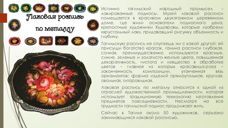 Слайд 7Истинно тагильский народный промысел – лакированные подносы. Музей лаковой росписи помещается