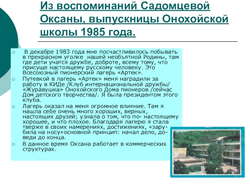 Слайд 22Из воспоминаний Садомцевой Оксаны, выпускницы Онохойской школы 1985 года.