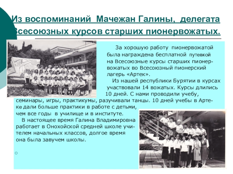Слайд 21Из воспоминаний Мачежан Галины, делегата Всесоюзных курсов старших пионервожатых.