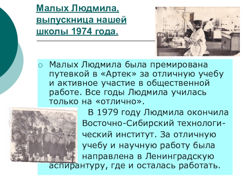 в «Артек» за отличную учебу и активное участие в общественной работе. Все годы Людмила училась только на «отлично».