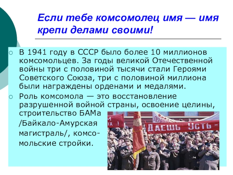 Слайд 6Если тебе комсомолец имя — имя крепи делами своими!