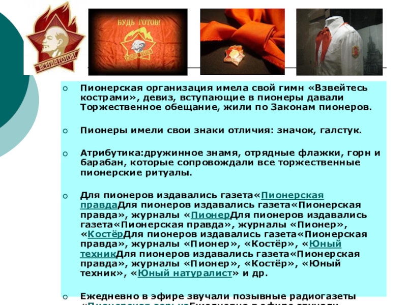 Для пионеров издавались газета«Пионерская правдаДля пионеров издавались газета«Пионерская правда», журналы «ПионерДля пионеров издавались газета«Пионерская правда», журналы «Пионер», «КостёрДля пионеров издавались газета«Пионерская правда», журналы «Пионер», «Костёр», «Юный техникДля пионеров издавались газета«Пионерская правда», журналы «Пионер», «Костёр», «Юный техник», «Юный натуралист» и др.