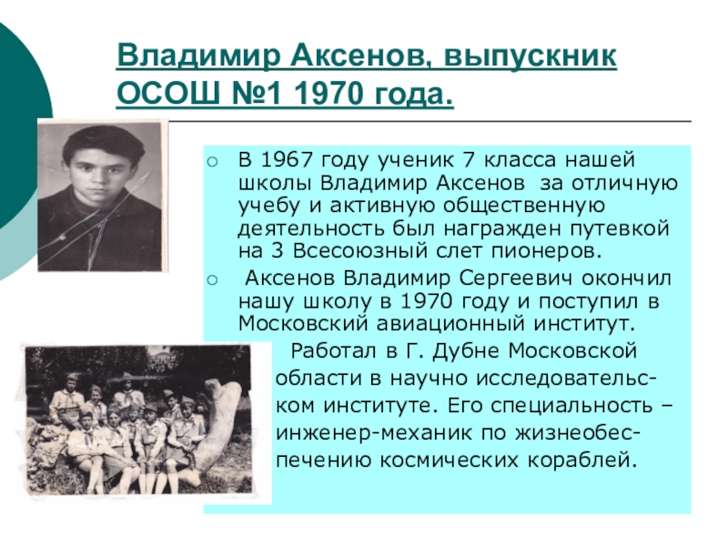 Слайд 15Владимир Аксенов, выпускник ОСОШ №1 1970 года.