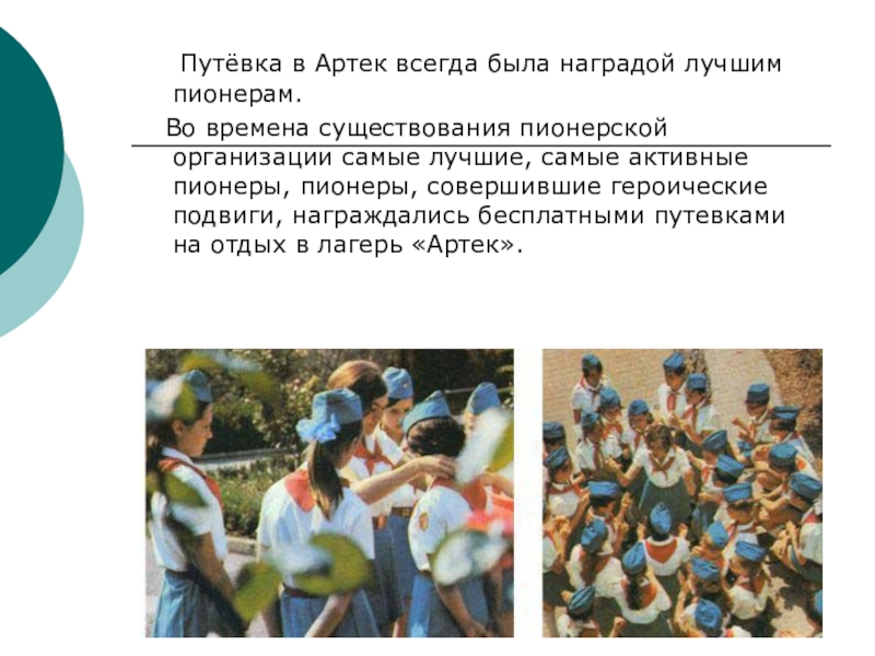 Во времена существования пионерской организации самые лучшие, самые активные пионеры, пионеры, совершившие героические подвиги, награждались бесплатными путевками на отдых в лагерь «Артек».