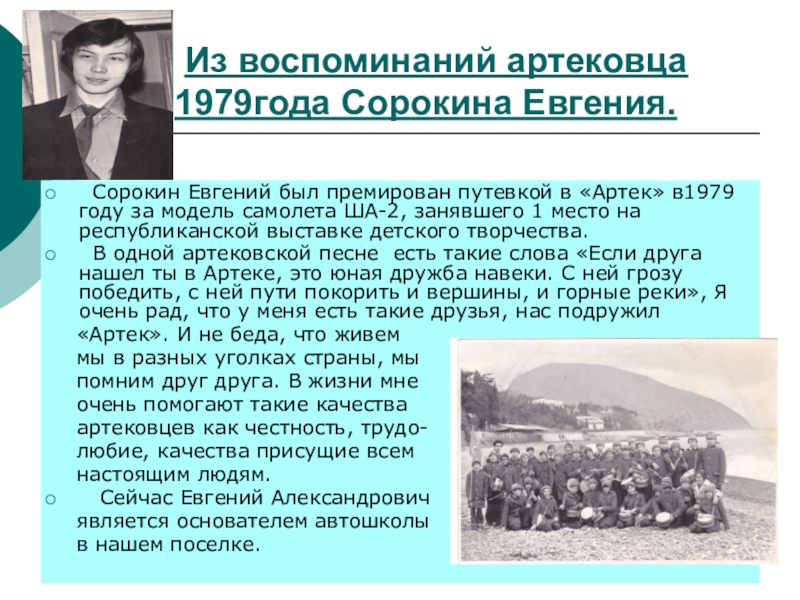 Слайд 19 Из воспоминаний артековца 1979года Сорокина Евгения.