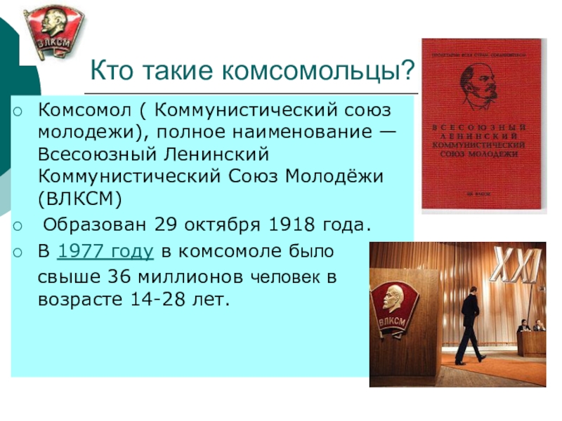 Комсомол ( Коммунистический союз молодежи), полное наименование — Всесоюзный Ленинский