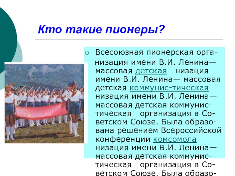 низация имени В.И. Ленина— массовая детская коммунис-тическая низация имени В.И. Ленина— массовая детская коммунис-тическая организация в Со-ветском Союзе. Была образо-вана решением Всероссийской конференции комсомола низация имени В.И. Ленина— массовая детская коммунис-тическая организация в Со-ветском Союзе. Была образо-вана решением Всероссийской конференции комсомола 19 мая низация имени В.И. Ленина— массовая детская коммунис-тическая организация в Со-ветском Союзе. Была образо-вана решением Всероссийской конференции комсомола 19 мая 1922 года низация имени В.И. Ленина— массовая детская коммунис-тическая организация в Со-ветском Союзе. Была образо-вана решением Всероссийской конференции комсомола 19 мая 1922 года, с тех пор 19 мая отмечается как День пионерии.