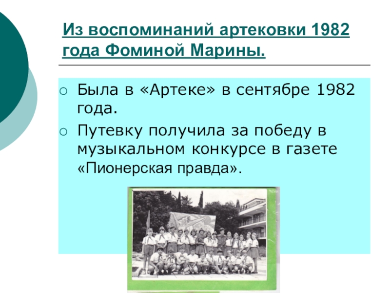 Слайд 20Из воспоминаний артековки 1982 года Фоминой Марины.