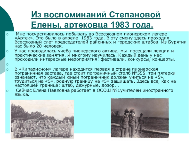 Слайд 23Из воспоминаний Степановой Елены, артековца 1983 года.