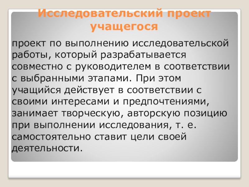 школьников – это деятельность учащихся под руководством учителя, связанная с решением творческой исследовательской задачи с заранее неизвестным решением и предполагающая наличие основных этапов, характерных для исследования в научной сфере.