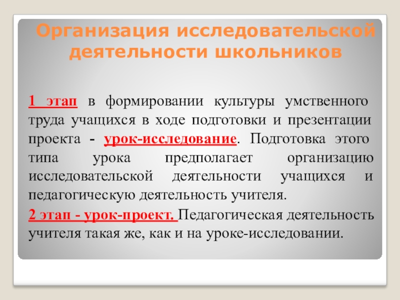 в ходе подготовки и презентации проекта - урок-исследование. Подготовка этого типа урока предполагает организацию исследовательской деятельности учащихся и педагогическую деятельность учителя.