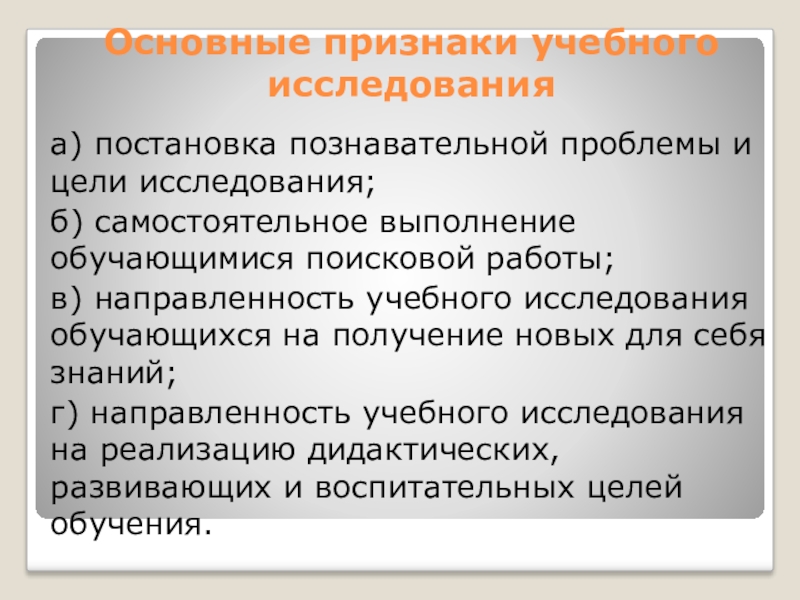 г) направленность учебного исследования на реализацию дидактических, развивающих и воспитательных целей обучения.