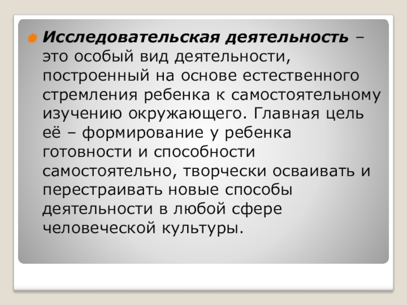 деятельности, построенный на основе естественного стремления ребенка к самостоятельному изучению окружающего. Главная цель её – формирование у ребенка готовности и способности самостоятельно, творчески осваивать и перестраивать новые способы деятельности в любой сфере человеческой культуры.