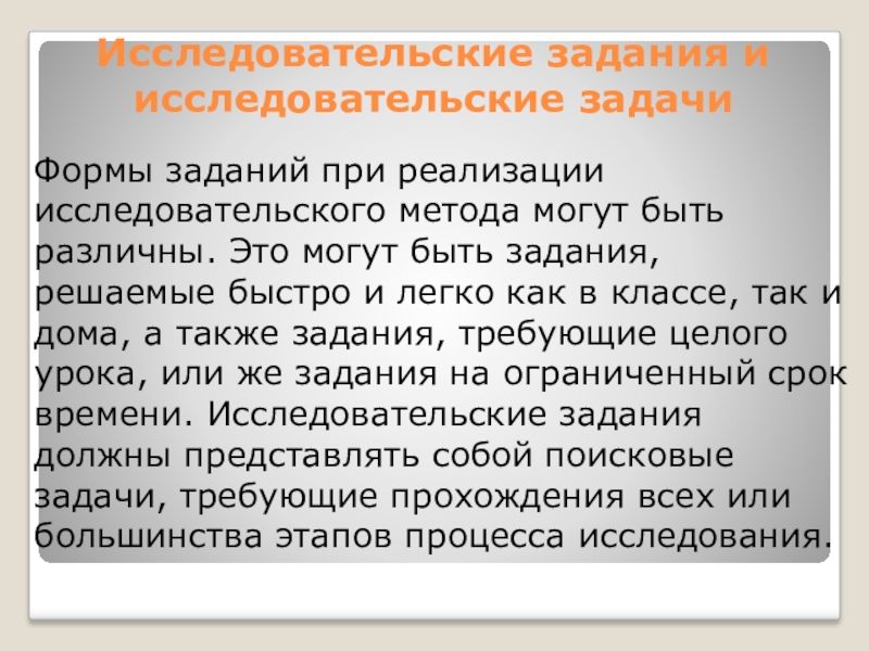 быть различны. Это могут быть задания, решаемые быстро и легко как в классе, так и дома, а также задания, требующие целого урока, или же задания на ограниченный срок времени. Исследовательские задания должны представлять собой поисковые задачи, требующие прохождения всех или большинства этапов процесса исследования.
