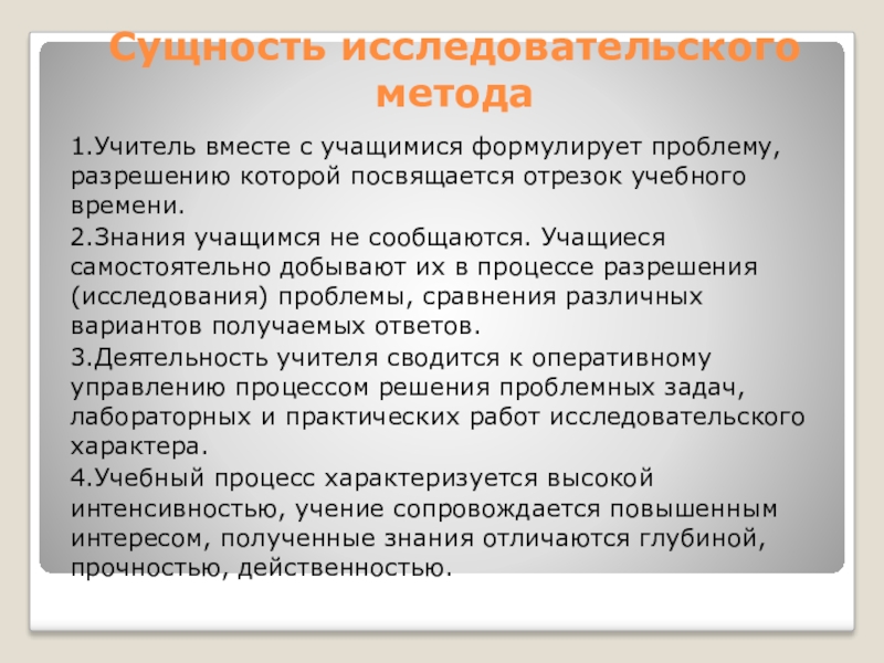 3.Деятельность учителя сводится к оперативному управлению процессом решения проблемных задач, лабораторных и практических работ исследовательского характера.