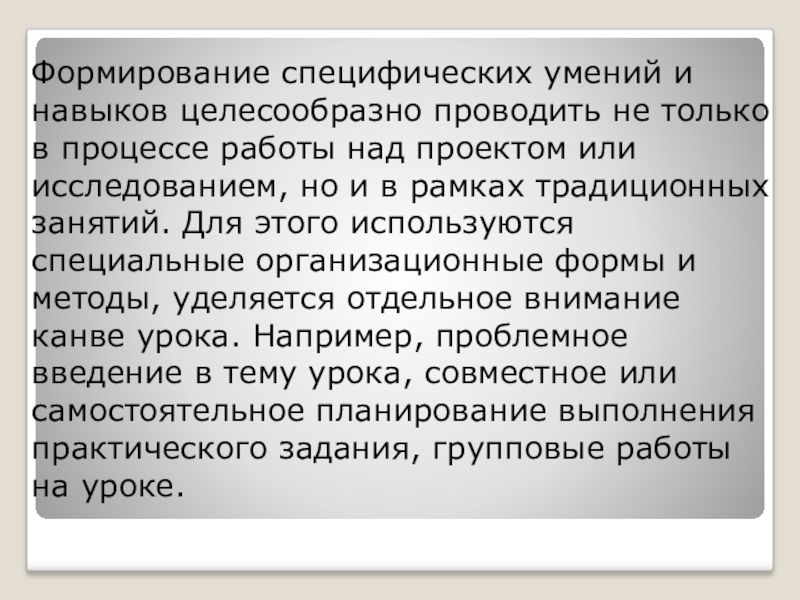 работы над проектом или исследованием, но и в рамках традиционных занятий. Для этого используются специальные организационные формы и методы, уделяется отдельное внимание канве урока. Например, проблемное введение в тему урока, совместное или самостоятельное планирование выполнения практического задания, групповые работы на уроке.