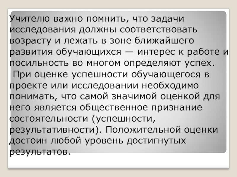При оценке успешности обучающегося в проекте или исследовании необходимо понимать, что самой значимой оценкой для него является общественное признание состоятельности (успешности, результативности). Положительной оценки достоин любой уровень достигнутых результатов.