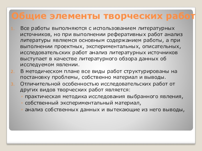 но при выполнении реферативных работ анализ литературы являемся основным содержанием работы, а при выполнении проектных, экспериментальных, описательных, исследовательских работ анализ литературных источников выступает в качестве литературного обзора данных об исследуемом явлении.