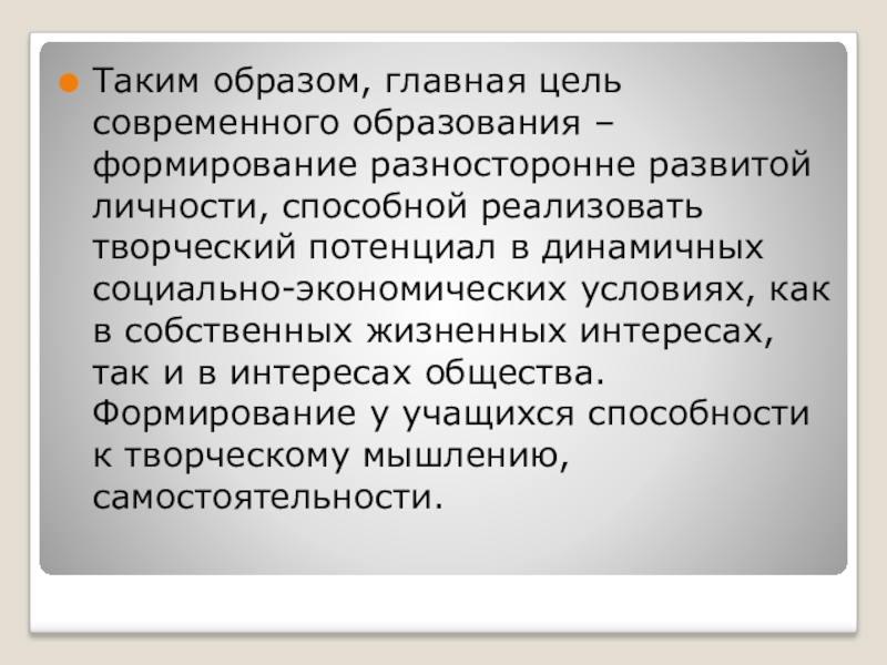 Таким образом, главная цель современного образования – формирование разносторонне развитой личности,