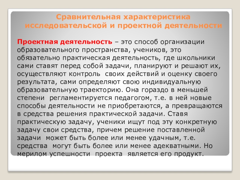образовательного пространства, учеников, это обязательно практическая деятельность, где школьники сами ставят перед собой задачи, планируют и решают их, осуществляют контроль своих действий и оценку своего результата, сами определяют свою индивидуальную образовательную траекторию. Она гораздо в меньшей степени регламентируется педагогом, т.е. в ней новые способы деятельности не приобретаются, а превращаются в средства решения практической задачи. Ставя практическую задачу, ученики ищут под эту конкретную задачу свои средства, причем решение поставленной задачи может быть более или менее удачным, т.е. средства могут быть более или менее адекватными. Но мерилом успешности проекта является его продукт.
