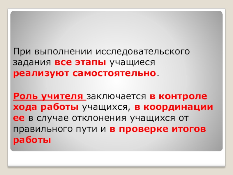 При выполнении исследовательского задания все этапы учащиеся реализуют самостоятельно.