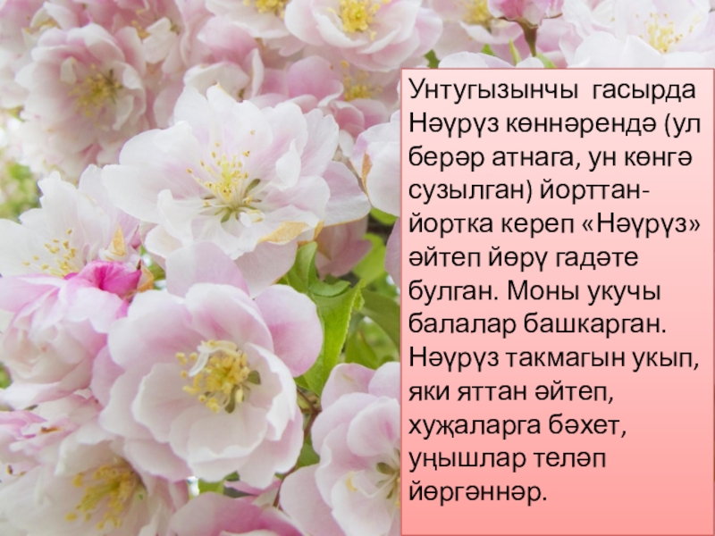 Унтугызынчы гасырда Нәүрүз көннәрендә (ул берәр атнага, ун көнгә сузылган) йорттан-йортка кереп «Нәүрүз» әйтеп йөрү гадәте булган. Моны укучы балалар башкарган. Нәүрүз такмагын укып, яки яттан әйтеп, хуҗаларга бәхет, уңышлар теләп йөргәннәр.