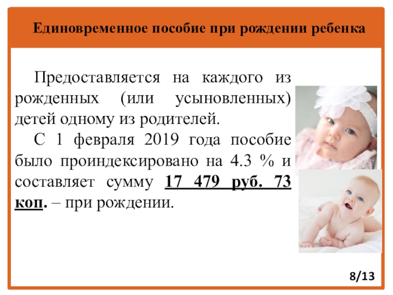 С 1 февраля 2019 года пособие было проиндексировано на 4.3 % и составляет сумму 17 479 руб. 73 коп. – при рождении.
