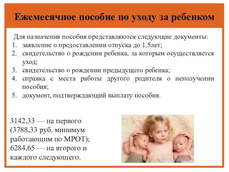 Предоставляется на каждого из рожденных (или усыновленных) детей одному из родителей.