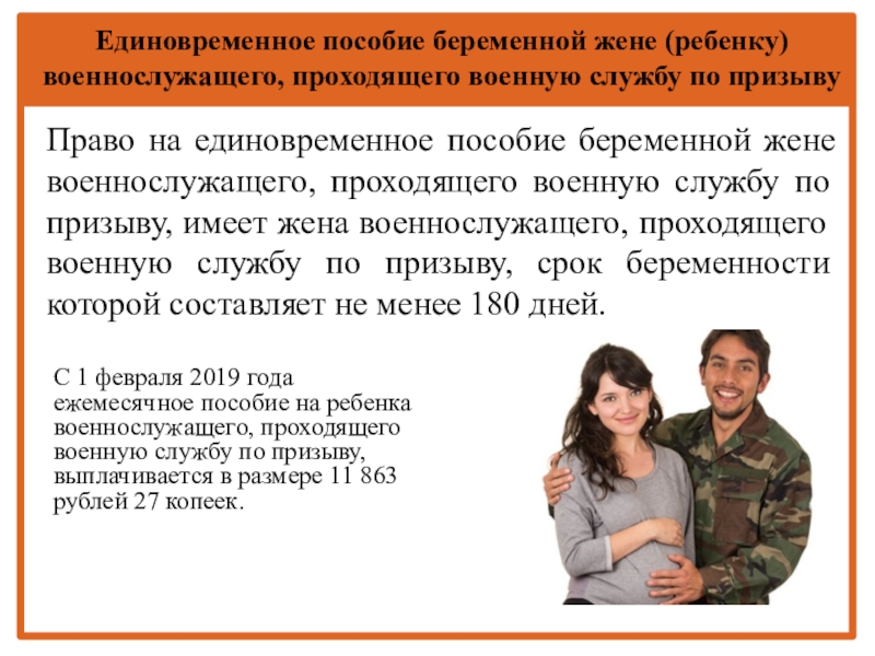 Право на единовременное пособие беременной жене военнослужащего, проходящего военную службу по призыву, имеет жена военнослужащего, проходящего военную службу по призыву, срок беременности которой составляет не менее 180 дней.