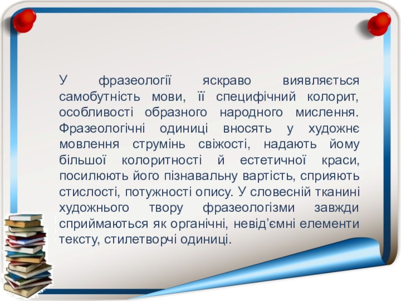У фразеології яскраво виявляється самобутність мови, її специфічний колорит, особливості образного