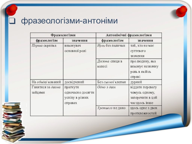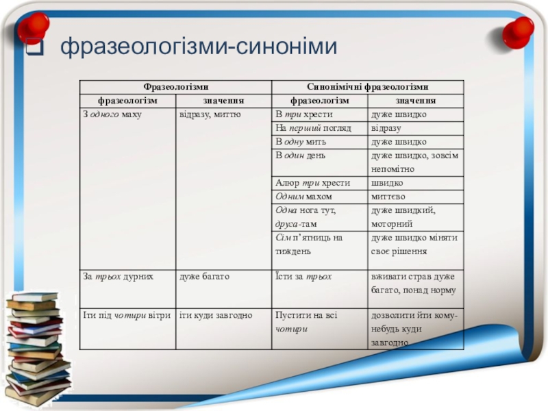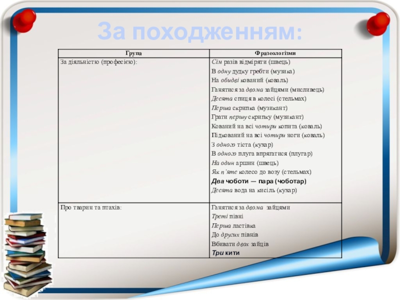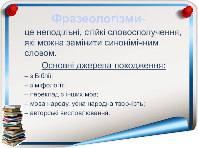 Фразеологізми-це неподільні, стійкі словосполучення, які можна замінити синонімічним словом.Основні джерела походження:– з Біблії; – з міфології; –