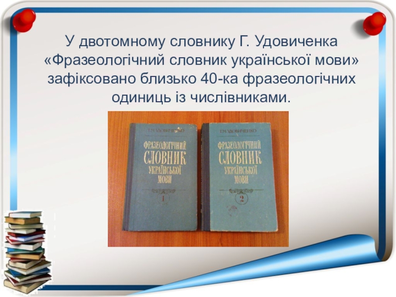 Слайд 10У двотомному словнику Г. Удовиченка «Фразеологічний словник української мови» зафіксовано близько