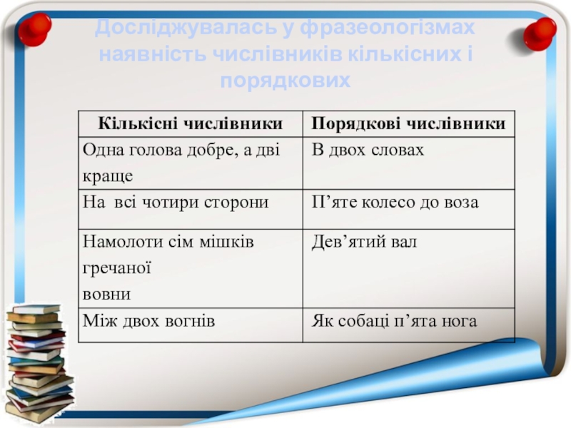 Слайд 11Досліджувалась у фразеологізмах наявність числівників кількісних і порядкових