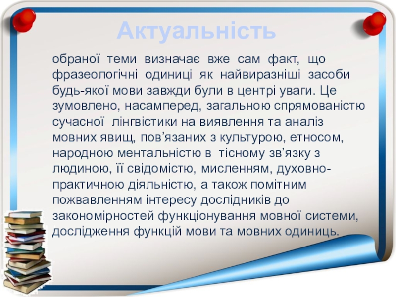 Актуальністьобраної теми визначає вже сам факт, що фразеологічні одиниці як найвиразніші засоби будь-якої мови завжди були в центрі уваги. Це зумовлено, насамперед, загальною спрямованістю сучасної лінгвістики на виявлення та аналіз мовних явищ, пов’язаних з культурою, етносом,