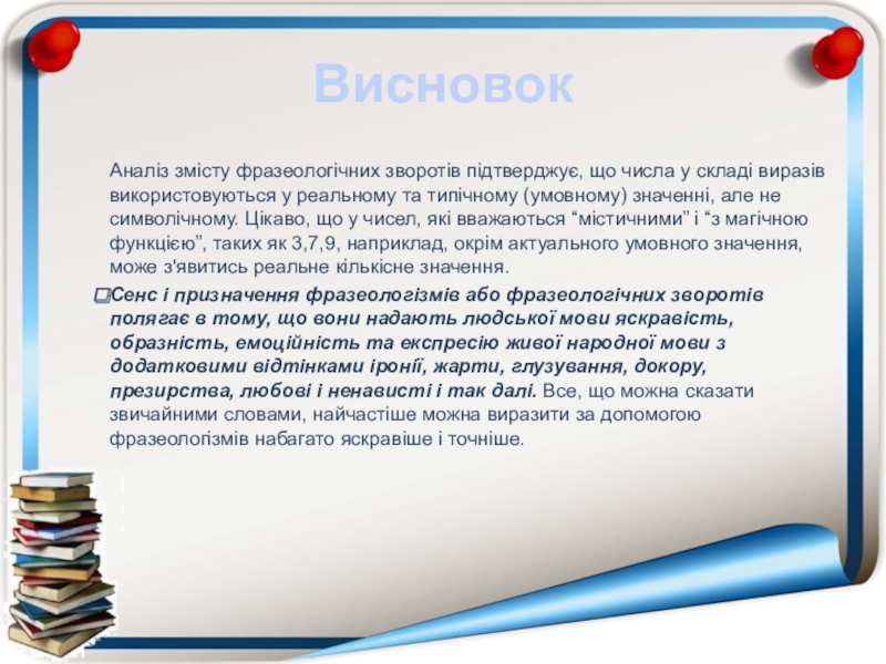 ВисновокАналіз змісту фразеологічних зворотів підтверджує, що числа у складі виразів використовуються у реальному та типічному (умовному) значенні,