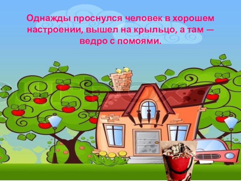 Слайд 10Однажды проснулся человек в хорошем настроении, вышел на крыльцо, а там