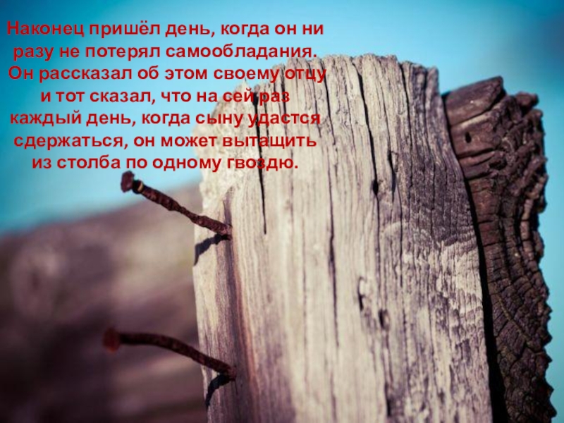 В первый день в столбе было несколько десятков гвоздей. На другой неделе он научился сдерживать свой гнев, и с каждым днём число забиваемых в столб гвоздей стало уменьшаться. Юноша понял, что легче контролировать свой темперамент, чем вбивать гвозди.