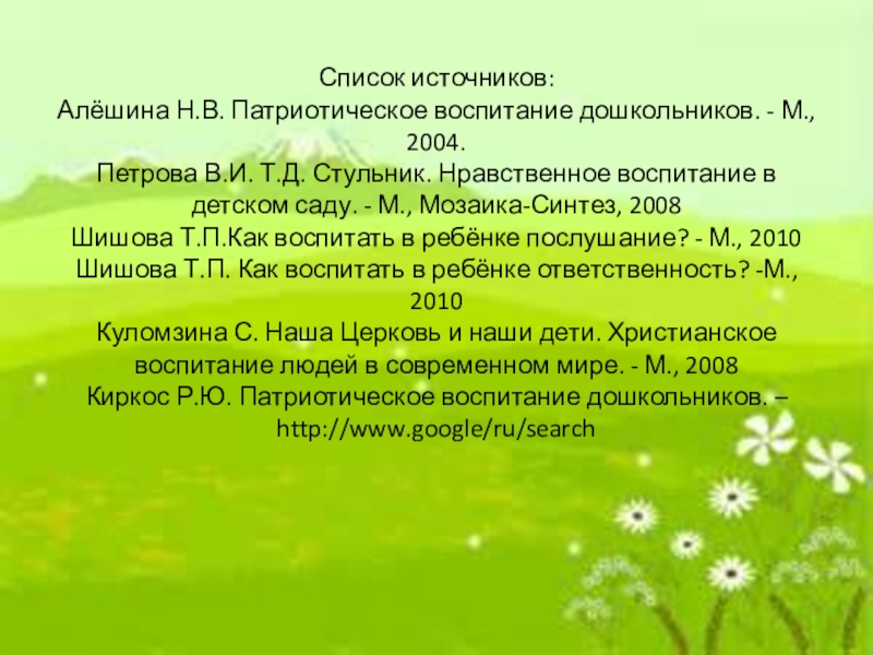 Алёшина Н.В. Патриотическое воспитание дошкольников. - М., 2004.