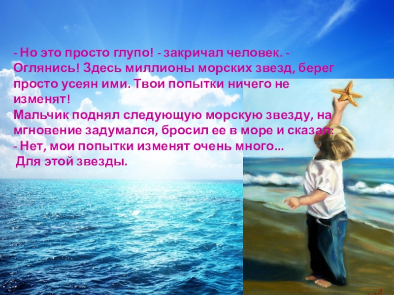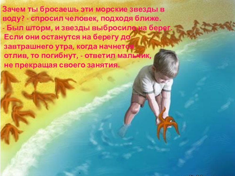 Слайд 6Зачем ты бросаешь эти морские звезды в воду? - спросил человек,