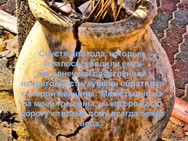 кувшин обратился к старой женщине:“Мне стыдно из-за моей трещины, из которой всю дорогу к твоему дому всегда бежит вода."